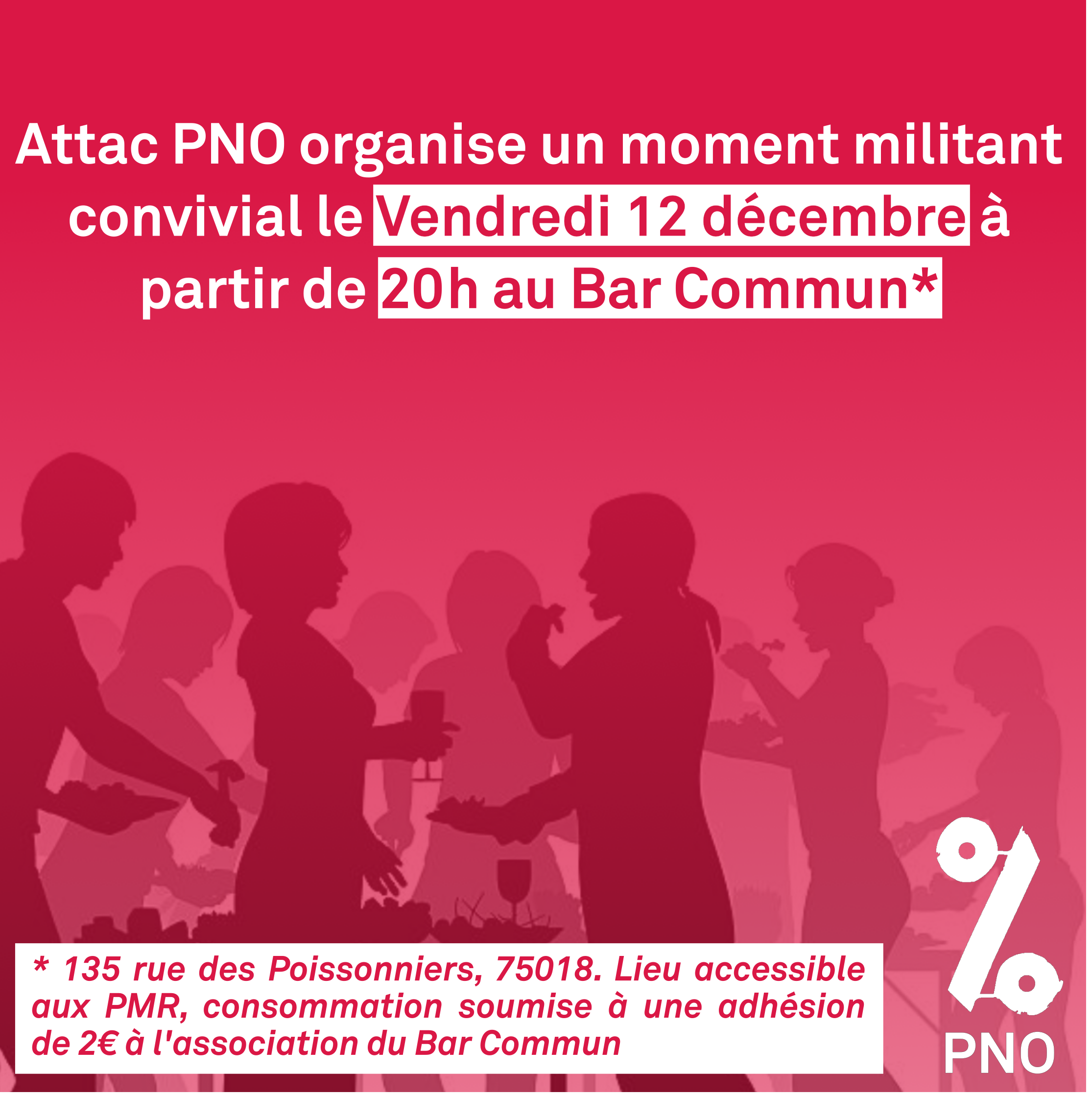 Attac PNO organise un moment militant convivial le Vendredi 12 décembre à partir de 20h au Bar Commun ! Lieu accessible aux PMR, consommation soumise à une adhésion de 2€ à l’association du Bar Commun.